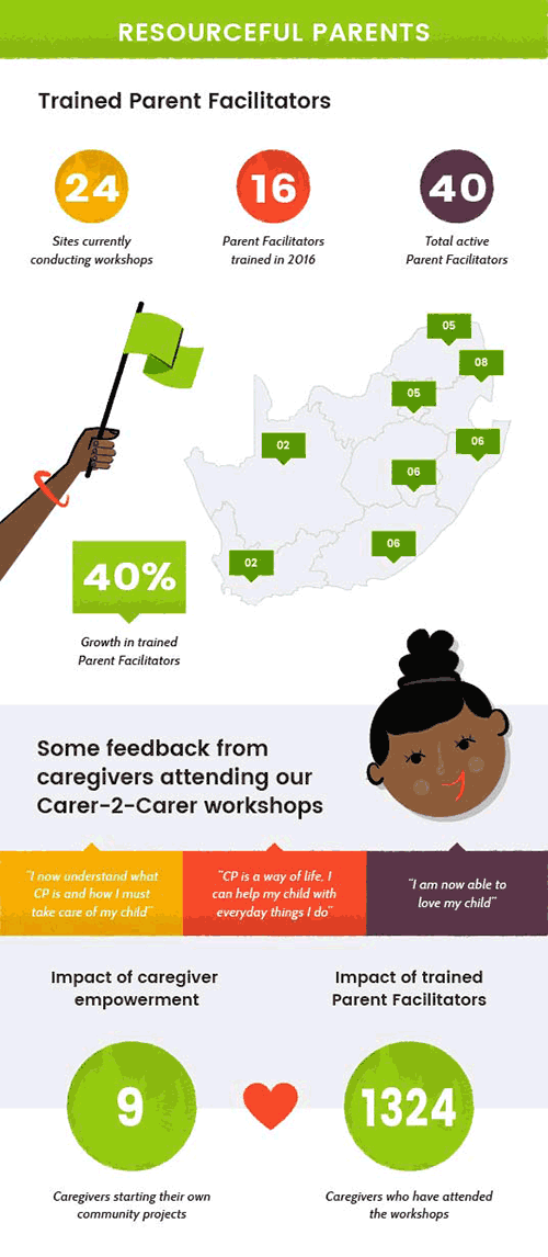 Over the past 5 years, our work has proven that parents learn better from other parents and that those parents who feel hopeless and are unable to accept their children’s condition, will struggle to learn about CP until their psychosocial and emotional needs are addressed. Parents/caregivers who are psychosocially well-adapted and who understand CP, contribute towards improving the effectiveness of the CP service through increased compliance to home programmes and adopting realistic expectations of what therapy can achieve.